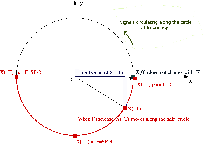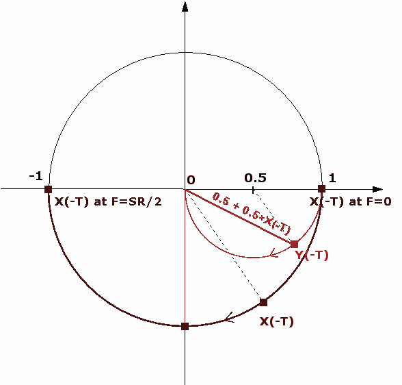 To watch the result of our filter, we just have to add graphically the 2 vector X(0) and X(-T) moving along the demi circle and divise by 2. Then the result is the red little circle :